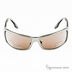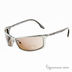 Стильные очки прямоугольной формы серебристого цвета. Тонкая оправа выполнена из алюминия. Основание заушников декорировано надписью Mercedes-Benz. Заушники с удлиненными пластиковыми наконечниками перламутро-серого оттенка. Линзы пластиковые коричневого цвета.
