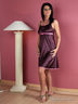 Средней длины скромная, но очень нежная сорочка, из шелкового сатина. По низу изделия и под грудью украшена шелковым кантом. Под грудью по центру маленький прямой бантик. Лиф имеет небольшую сборку сверху и снизу, что создает объем груди. Бретели из шелкового ролика, регулируемые.