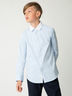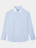 Голубая сорочка в тонкую полоску с контрастным белым воротником привнесет в образ школьника индивидуальность. Актуальный прилегающий силуэт, модная форма воротника, плотная и мягкая хлопковая ткань, создающая комфорт в носке, делают сорочку незаменимой для создания стильного делового образа мальчика.