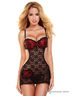 Ажурная сорочка в черном цвете с добавлением красных оттенков. Лиф в красном цвете из атласного материала покрыт цветочным кружевом, плотные чашечками на косточках, сзади застежки крючки. Бретели регулируемой длины. Сорочка завязывается сзади на бантик. В комплекте трусики-стринги.