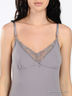 Сорочка на тонких регулирующихся бретельках расклешенного кроя из тонкого трикотажа. V-образный вырез декорирован кружевом.