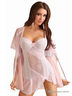 Короткая сорочка-корсет. Чашки на тонком поролоне. Стан облегающий по фигуре, выполнен из двух видов ткани: полупрозрачной розовой и эластичной ткани в полоску. По верху лифа и спереди на стане отделка широким кружевом. По низу сорочки оборка с разрезом. Бретели узкие, регулируемые не убираются. В комплекте узкие стринги.