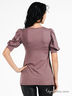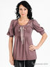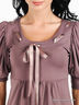 Детали: округлый вырез горловины декорирован продетой атласной лентой с бантиком, короткий рукав посажен на манжету, отрезной лиф, складки