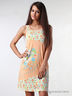Сорочка приталенного силуэта, без рукавов. Горловина круглой формы. Полочка резная. Низ изделия прямой. Горловина и проймы обработаны бейкой. На центральную часть полочки нанесен принт. По горловине спинки располагается отлетной шеврон.