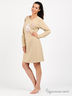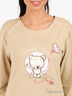 Трикотажная сорочка с косыми застёжками на пуговицах по плечам. На груди меховая аппликация, принт и вышивка шёлковыми нитями. На плече принт. Манжеты рукавов декорированы пуговками и шёлковой тесьмой.