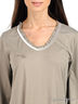 Детали: V-образный вырез и манжеты декорированы оригинальными бархатистыми вставками и оборками