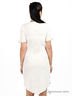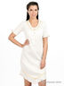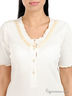 Детали: округлый вырез горловины, застежка на четыре пуговицы, полочка и подол украшены декоративно пришитой атласной лентой; края ворот, рукавов и низ изделия обработаны оверлоком