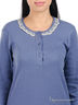 Детали: округлый вырез горловины, застежка на три пуговицы, ворот и подол декорированы кружевом с вышивкой, край рукава и подол обработаны оверлоком