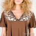 Ночная сорочка с коротким рукавом выполнена из стуящейся вискозы шоколадного цвета. Свободный крой не стесняет движений. V-образный вырез украшен кружевом с шитьем из контрастных нитей. На полочке декоративные складки. Белая тесьма на вырезе, рукавах и подоле сорочки. Атласные бантики завершают декор сорочки.