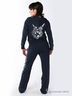 Спортивный костюм с капюшоном,рукав реглан, сзади рисунок тигра из страз; длинные брюки с карманами и широкими лампасами контрастной расцветки. Отличный вариант для повседневного использования.