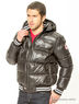 Стеганый блузон из блестящей ткани. Застежка на молнию. Капюшон. Принт на груди и нашивка на рукаве. Карманы на молнии. Воротник, манжеты и низ из трикотажной резинки в полоску.