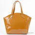Оригинальная женская сумка из натуральной лаковой кожи гладкой фактуры. Стенки изделия мягкие. Декорирована брелоком. Основное отделение застегивается на молнию. Внутри два открытых кармашка и один прорезной карман на молнии. Без подкладки. Короткие ручки. Цвет фурнитуры -серебро. Мягкое формованное дно без ножек.