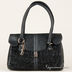 Элегантная женская сумка из искусственной кожи. Стенки изделия мягкие. Сумка декорирована тканевой вставкой. Основное отделение застегивается на молнию и клапан с поворотным замком. Внутри три открытых кармашка и два прорезных на молнии. Подкладка - текстиль. Две ручки средней длины, в комплекте съемный плечевой ремень. Цвет фурнитуры - золотистый. Дно мягкое формованное, без ножек.