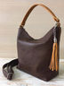 Небольшая сумка-мешок с 2 видами ремней. Внутри отделение под ключи и телефон, а также внутри и снаружи прорезной карман на молнии. Размер: 24*28*12 см.