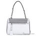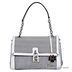 Женская сумочка "Dispacci" оригинальной формы, выполнена из натуральной кожи белого цвета с тиснением "гусиная лапка". На задней стенке - удобный карман на молнии. Внутри - два отделения, разделенные средником на молнии. В одном - карман на молнии, в другом - открытый карман и карман для мобильного. Сумка закрывается на общую металлическую молнию и клапан с оригинальным замком. Цвет фурнитуры - серебро.
