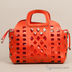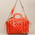 Изящная женская сумка из экокожи. Стенки изделия мягкие. Двойная сумка - внешняя часть с крупной перфорацией, внутренняя часть - лаковая. Основное отделение застегивается на металлическую молнию. Внутри два открытых кармашка и один прорезной карман на молнии. Подкладка - текстиль. Ручки средней длины позволяют носить сумку в руке, в комплекте съемный ремешок. Цвет фурнитуры - золото, ножки. Дно формованное.