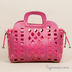 Изящная женская сумка из экокожи. Стенки изделия мягкие. Двойная сумка - внешняя часть с крупной перфорацией, внутренняя часть - лаковая. Основное отделение застегивается на металлическую молнию. Внутри два открытых кармашка и один прорезной карман на молнии. Подкладка - текстиль. Ручки средней длины позволяют носить сумку в руке, в комплекте съемный ремешок. Цвет фурнитуры - золото, ножки. Дно формованное.