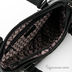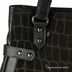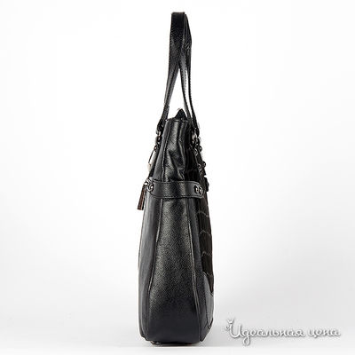 Большая сумка ELEGANZZA изготовлена из натуральной кожи черного цвета. На передней стенке - вставка из нубука с тиснением под рептилию. На задней стенке имеется удобный кармашек на молнии. Внутри - два отделения, разделённые средником на молнии, в одном имеется кармашек на молнии, в другом - кармашек для мобильного телефона и открытый кармашек. Сумка закрывается на общую пластиковую молнию. Ножки на дне есть. Цвет фурнитуры - чернёное серебро. Модель вмещает формат А4. Пустая сумка хорошо держит форму. Высота ручек (17 см) не позволяет носить сумку на плече. Наплечного ремня в комплекте нет.