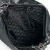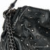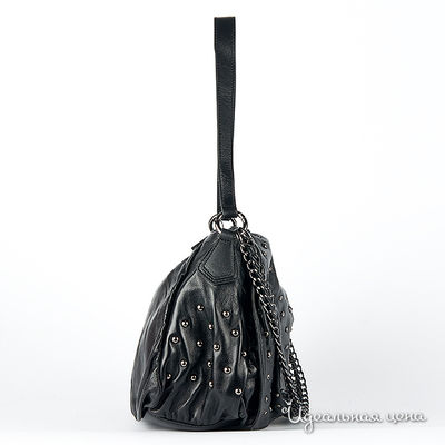 Необычная, стильная сумка из натуральной кожи черного цвета. Внутри – одно отделение, в котором имеется карман на молнии, карман для мобильного и открытый карман. На задней стенке - удобный карман на молнии. Сумка закрывается на общую пластиковую молнию и дополнительно на клапан на магнитной кнопке. Клапан и боковые стороны сумки декорированы металлическими блочками со стразами. Цвет фурнитуры – блестящее серебро. Сумка не вмещает формат А4. Пустая сумка не держит форму. Ножек на дне нет. Высота ручки – 25 см. позволяет носить сумку на плече. В комплекте - ремень, декорированный цепочкой.