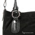 Изящная сумка из натуральной гладкой замши и небольших вставок из кожи. Сумка имеет мягкие стенки. На задней стороне сумки один карман на молнии. Основное отделение застегивается на металлическую молнию. Внутри одно большое просторное отделение разделенное мягкой перегородкой на молнии, один небольшой карман на молнии и два открытых кармашка для кошелька и мобильного. Плотные ручки небольшой длины и длинный тонкий ремешок из прошитой кожи. 4 металлические ножки. Цвет фурнитуры - темное серебро.