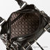 Женская сумка ELEGANZZA выполнена из натуральной кожи черного цвета. На боковых стенках - вставка из натуральной кожи с лазерной обработкой, орнамент под леопарда. Сумка закрывается на общую металлическую молнию. На задней стенке имеется удобный кармашек на молнии. Внутри - одно отделение, в котором имеется кармашек на молнии, кармашек для мобильного телефона и открытый кармашек. Ножки на дне есть. Отделка натуральной кожей черного цвета с тиснением под рептилию. Цвет фурнитуры - блестящее серебро. Модель не вмещает формат А4. Пустая сумка держит форму. Высота ручек (15 см) не позволяет носить сумку на плече. В комплекте есть наплечный ремень (тиснение под рептилию).