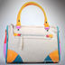 Яркая женская сумка из искусственной кожи. Стенки изделия средней плотности. Сзади и спереди прорезное отделение на молнии. Один основной отдел застегивается на молнию. Ручки короткие. Цвет фурнитуры - серебро. Дно формованное.