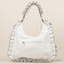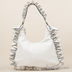 Оригинальная женская сумка из искусственной кожи. Стенки изделия мягкие. Один внешний карман на молнии. Основное отделение застегивается на молнию. Внутренняя часть разделена текстильной перегородкой на молнии. Внутри два открытых кармашка и один прорезной карман на молнии. Подкладка - текстиль. Плечевой ремень и край сумки декорированы оригинальной рюшей. Цвет фурнитуры - серебристый.