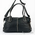 Женская сумка черного цвета из искусственной кожи гладкой фактуры. Сумка имеет мягкие стенки. Застежка на молнию. Наплечный ремень отстегивается, регулируется по длине. С двумя ручками. Сумка дополнена металлическими застежками, регулирующими форму изделия. Внутри одно большое отделение. Карман для мобильного телефона, открытый карман. Мягкое формованное дно, без ножек.