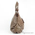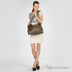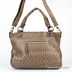 Женская сумка цвета хаки из искусственной кожи рельефной фактуры. Сумка имеет мягкие стенки. Застежка на молнию. Наплечный ремень отстегивается, регулируется по длине. С двумя плетеными ручками. Сумка дополнена коричневыми вставками с металлическими клепками. Внутри одно большое отделение. Карман для мобильного телефона, открытый карман. Мягкое дно, без ножек.
