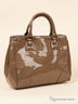 Оригинальная сумка из лакированной кожи. Передняя часть декорирована крупной полупрозрачной вставкой. Боковые стенки дополнены кнопками для регулирования внутреннего объема. Два дополнительных отделения на молнии. Основное отделение застегивается на кнопку. Внутри два накладных кармана и один прорезной карман на молнии. Сумка вмещает формат А4.Плотное дно дополнено четырьмя металлическими ножками. Короткие ручки позволяют носить сумку на руке.