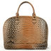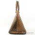 Броская женская сумка из искусственной фактурной кожи под крокодила. Стенки изделия плотные. Основное отделение застегивается на металлическую молнию. Внутри один открытый кармашек и один прорезной карман на молнии. Подкладка текстиль. Небольшие ручки. Цвет фурнитуры - золотой. Дно формованное с металлическими ножками.