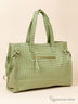 Стильная сумка из мягкой кожи с вплетенными вставками. На боковых стенках расположены кнопки для регулирования внутреннего объема. Основное отделение застегивается на магнитную кнопку. Внутри располагается текстильный съемный отдел с прорезным карманом на молнии и двумя накладными карманами. Сумка вмещает формат А4. Плотное дно не дополнено ножками. Ручки средней длины позволяют носить сумку на плече.