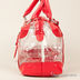 Изящная женская сумка из плотного полиэтилена со вставками из заменителя кожи. Стенки изделия мягкие. Передняя часть сумки декорирована брелоком на пряжке. Основное отделение застегивается на молнию. Подкладка отсутствует. Короткие ручки, в комплекте съемный ремешок. Цвет фурнитуры - серебро, ножки отсутствуют. Дно средней жесткости, формованное.