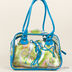 Яркая женская сумка из плотного полиэтилена со вставками из искусственной лаковой кожи. Стенки изделия жесткие. Передняя часть сумки декорирована нашивкой в виде логотипа бренда. Основное отделение застегивается на молнию. Внутри атласный мешочек на кулиске с ремешком. Ручки средней длины позволяют носить сумку на плече. Цвет фурнитуры - серебро, ножки отсутствуют. Дно жесткое, формованное.