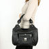 Сумка, материал - ткань, искусственная кожа с кожаными вставками ( клапан); две ручки средней длины; два магнита по бокам сумки; застежка на молнию. Внутри: три отделения, одно из которых на молнии; карман на молнии и два маленьких кармашка. Дно защищено металлическими ножками.