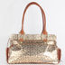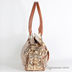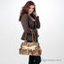 Изящная женская сумка. Стенки изделия плотные. Основное отделение застегивается на металлическую молнию. Один внешний карман с клапаном. Внутри два открытых кармашка и один прорезной карман на молнии. Подкладка - текстиль. Ручки средней длины позволяют носить сумку на плече. Цвет фурнитуры - золотистый, пять металлических ножек. Дно формованное. Сумка декорирована оригинальными пряжками с кристаллами и принтом.