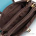 Основные отделения застегиваются на хлястик на замке. Сумка состоит из трех карманов на молнии сшитых вместе. Спереди изделие украшено металлической вставкой. В комплекте два наплечных ремня разной длины.