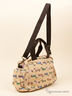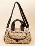 Компактная женская сумка выполнена из текстиля. Не вмещает формат А4. С внешней стороны расположен карман с клапаном на липучке и два кармана на молнии. Основное отделение застегивается на молнию. Внутри: два открытых кармана для мелочей и отделение на молнии. Наплечный ремень отстегивается от изделия. Дно мягкое.