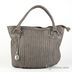 Женская сумка серого цвета из искусственной кожи гладкой фактуры. Сумка имеет мягкие стенки. Застежка на металлическую молнию. Сумка декорирована вертикальной прошивкой, создающей эффект складок и металлическими деталями. Без наплечного ремня. С двумя ручками. Внутри одно большое отделение, разделенное средником на молнии. Карман на молнии, карман для мобильного телефона, открытый карман. мягкое дно, без ножек.
