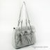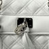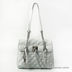 Стильная небольшая сумка из стеганной кожи с декоративным замочком с лицевой стороны. Основное отделение под клапаном на кнопке, разделенное на две части карманом на молнии. Имеются карманы разного типа для аксессуаров. Подкладка - бежевый хлопок, фурнитура - серебро. Мягкие ручки средней длины из металла и кожи.