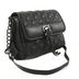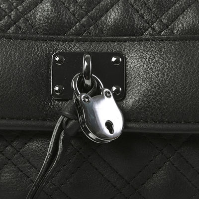 Стильная маленькая сумка из стеганной кожи с декоративным замочком с лицевой стороны. Основное отделение под клапаном на кнопке, разделенное на две части карманом на молнии. Имеются карманы разного типа для аксессуаров. Подкладка - серый хлопок, фурнитура - никель. Мягкий ремешок средней длины из металла и кожи.