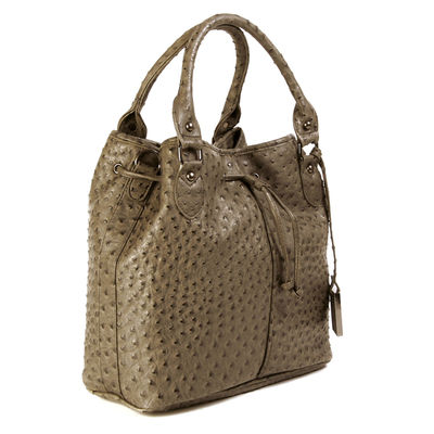 Вместительная сумка из экокожи под страуса, с лицевой стороны декорирована затяжными ремешками, за счет них бока немного собраны. Основное отделение закрывается на молнию и содержит разного типа карманы. Подкладка бежевый нейлон, фурнитура серебро. Короткие жесткие ручки.