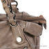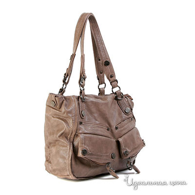 Интересная модель с одним отделением на молнии содержит разного типа карманы. С лицевой стороны два кармана на молнии в виде клапана на кнопке, с задней - карман на молнии. Подкладка серый нейлон, фурнитура - черный антик. Ручки мягкие средней длинны.
