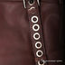 Дамская сумка. Одно отделение на молнии. Внутри сумки отделение на молнии, разделяющее ее на две части. Так же карманы разного типа. Декоративные элементы в виде сжатости с лицевой и задней стороны, ремешков с клепками. Подкладка бежевый хлопок, фурнитура - черный антик. Ручки мягкие, короткие. Съемный, регулируемый плечевой ремень. Дно мягкое.