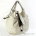 Модель необычной формы с декоративным бантом и карманом на молнии с лицевой стороны и карманом на молнии с задней стороны. Основное отделение закрывается на молнию и содержит карманы разного типа. Подкладка - бежевый хлопок, фурнитура - серебро. Жесткие ручки средней длины.