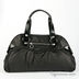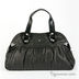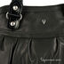 Женская сумка черного цвета из натуральной кожи гладкой фактуры. Сумка имеет мягкие стенки. Застежка на металлическую молнию. На задней стенке карман на металлической молнии. Без наплечного ремня. С двумя лаковыми ручками. Сумка декорирована оригинальными складками и металлическими клепками. Внутри одно большое отделение, разделенное средником на молнии. Карман для мобильного телефона, открытый карман. Формованное мягкое дно, металлические ножки.