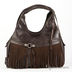 Женская сумка коричневого цвета из натуральной кожи гладкой фактуры. Сумка имеет жесткие стенки. Застежка на молнию. Два передних кармана. Без наплечного ремня. С двумя ручками. Сумка декорирована бахромой и клепками. Внутри одно большое отделение, разделенное средником на молнии. Карман на молнии, карман для мобильного телефона, открытый карман. Формованное мягкое дно, металлические ножки.