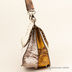 Основные отделения закрываются на клапаны, один на магнитной кнопке, второй на застежке. На внутренних стенках один втачной карман на молнии. Ручки отстегиваются. Наплечный ремень регулируется по длине и отстегивается от изделия. Дно формованное. Изделие декорировано металлическими клепками.