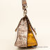 Основные отделения закрываются на клапаны, один на магнитной кнопке, второй на застежке. На внутренних стенках один втачной карман на молнии. Ручки отстегиваются. Наплечный ремень регулируется по длине и отстегивается от изделия. Дно формованное. Изделие декорировано металлическими клепками.