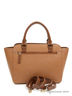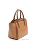Женская сумка из натуральной кожи бежевого цвета. Внутри два отдела, разделены средником на молнии, с одной стороны скрытый карман на молнии, с другой два открытых кармана для сотового телефона и мелочи. Размеры: длина 37 см, высота 22 см, ширина 13 см, длина ручек 12 см.